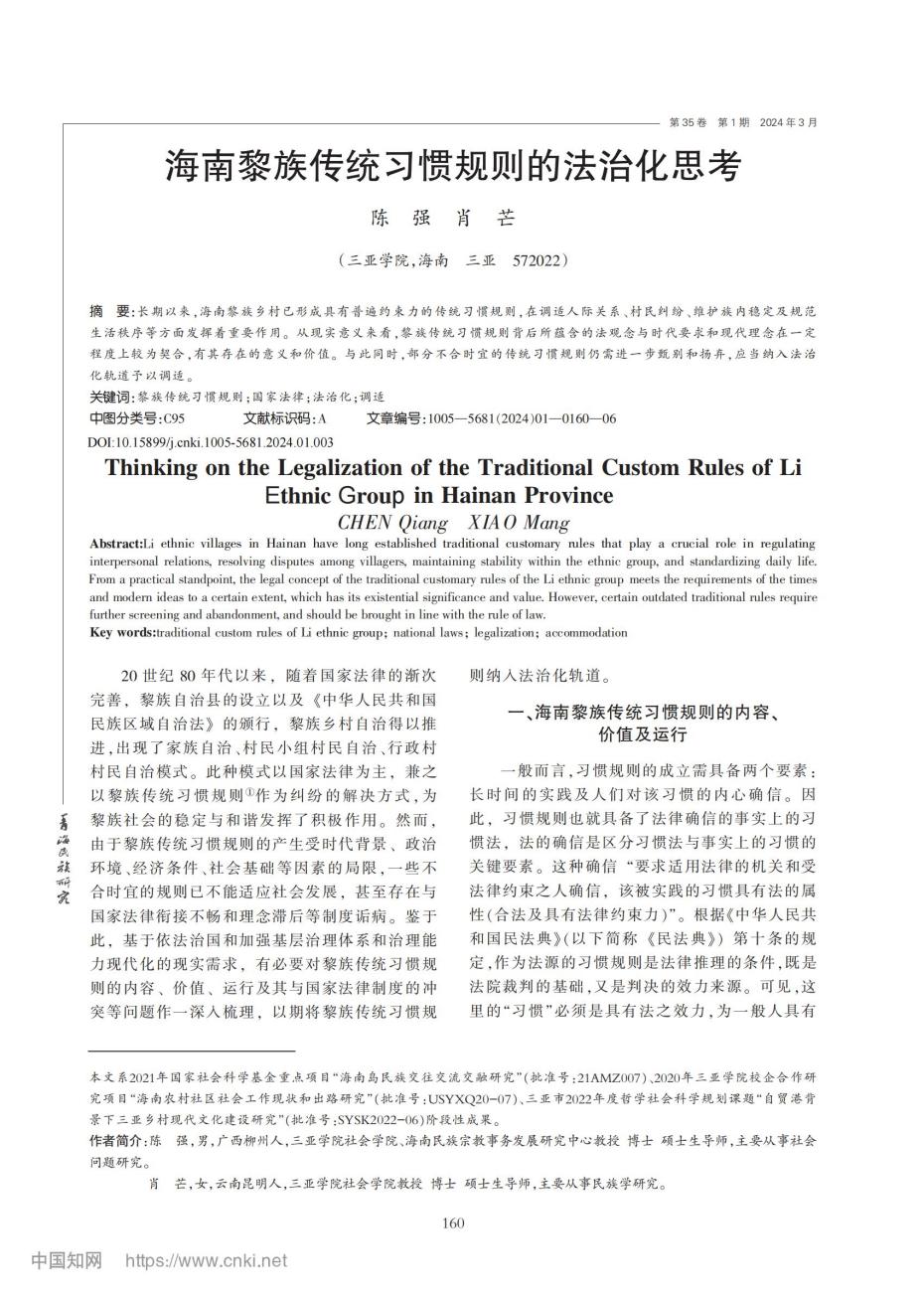 陳強(qiáng)教授、肖芒教授合作的論文《海南黎族傳統(tǒng)習(xí)慣規(guī)則的法治化思考》發(fā)表在《青海民族研究》2024年第1期。該成果聚焦海南黎族傳統(tǒng)習(xí)慣規(guī)則的法治化路徑,具有一定的社會影響。學(xué)術(shù)層面,進(jìn)一步豐富了民族習(xí)慣法在地方法治建設(shè)中系統(tǒng)性研究的成果,為多民族地區(qū)法治實踐提供理論參照。社會層面,推動黎族文化保護(hù)與現(xiàn)代法治的有機(jī)融合,既維護(hù)少數(shù)民族文化傳承,又增強(qiáng)基層社會治理的包容性。政策層面,為海南自貿(mào)港建設(shè)中的民族事務(wù)治理創(chuàng)新提供思路,促進(jìn)國家法與民族習(xí)慣法的良性互動。實踐層面,助力地方立法吸納傳統(tǒng)規(guī)則中的生態(tài)保護(hù)、糾紛調(diào)解等有益元素,提升民族地區(qū)法治認(rèn)同,對維護(hù)民族團(tuán)結(jié)、推進(jìn)鄉(xiāng)村振興具有現(xiàn)實意義。文章發(fā)表后,海南民族宗教事務(wù)發(fā)展研究中心官網(wǎng)將其收錄于“民族習(xí)慣法研究”專題成果目錄中,作為海南黎族法治化研究的代表性文獻(xiàn)進(jìn)行推廣。