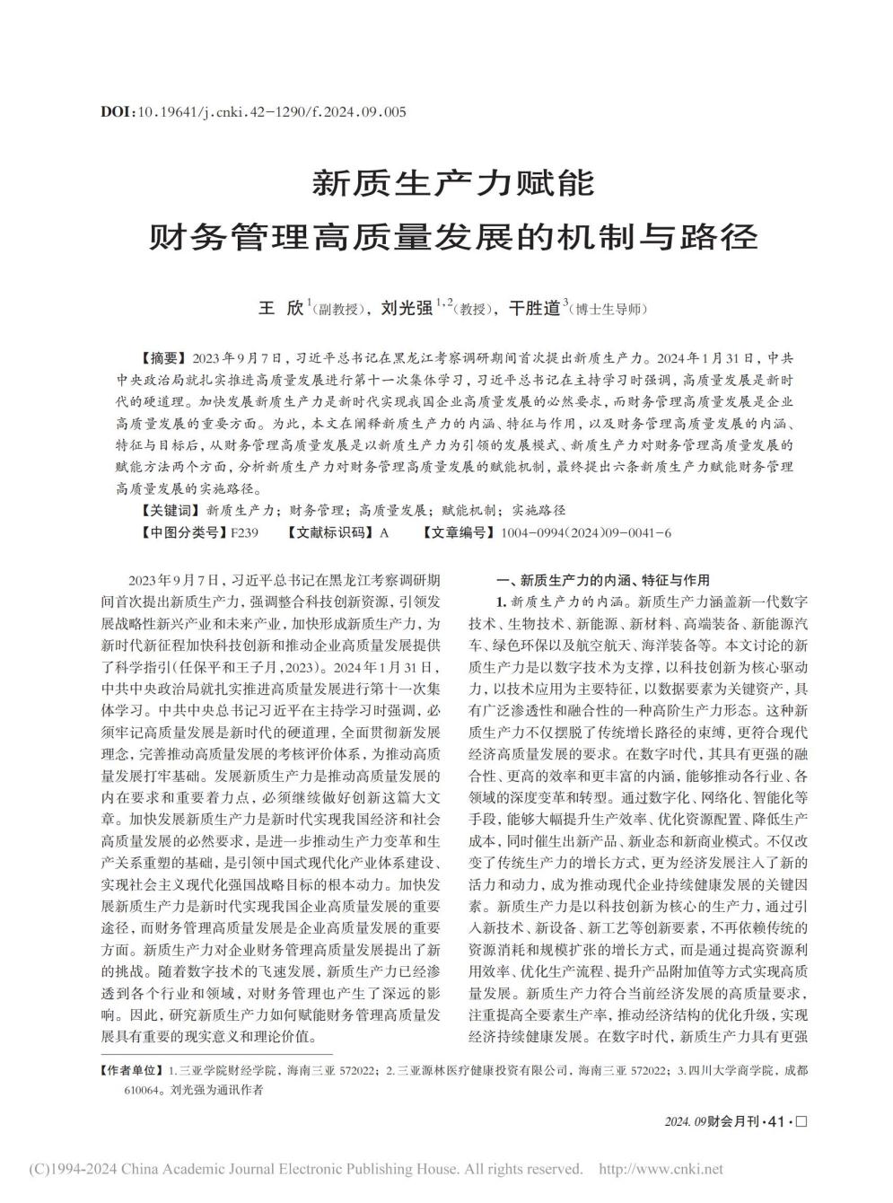 王欣教授、劉光強(qiáng)教授等合作的論文《新質(zhì)生產(chǎn)力賦能財務(wù)管理高質(zhì)量發(fā)展的機(jī)制與路徑》發(fā)表于《財會月刊》2024年第9期。文章深入探討了新質(zhì)生產(chǎn)力賦能財務(wù)管理高質(zhì)量發(fā)展的機(jī)制與路徑,提出了六條新質(zhì)生產(chǎn)力賦能財務(wù)管理高質(zhì)量發(fā)展的實施路徑:構(gòu)建數(shù)字化財務(wù)管理系統(tǒng)、優(yōu)化財務(wù)管理流程、加強(qiáng)財務(wù)風(fēng)險管理、推動業(yè)財一體化深度融合、培養(yǎng)數(shù)字化財務(wù)管理人才和持續(xù)創(chuàng)新財務(wù)管理模式。文章發(fā)表后被中國人民大學(xué)書報資料中心復(fù)印報刊資料《財會文摘》2024年05期收錄為文摘。