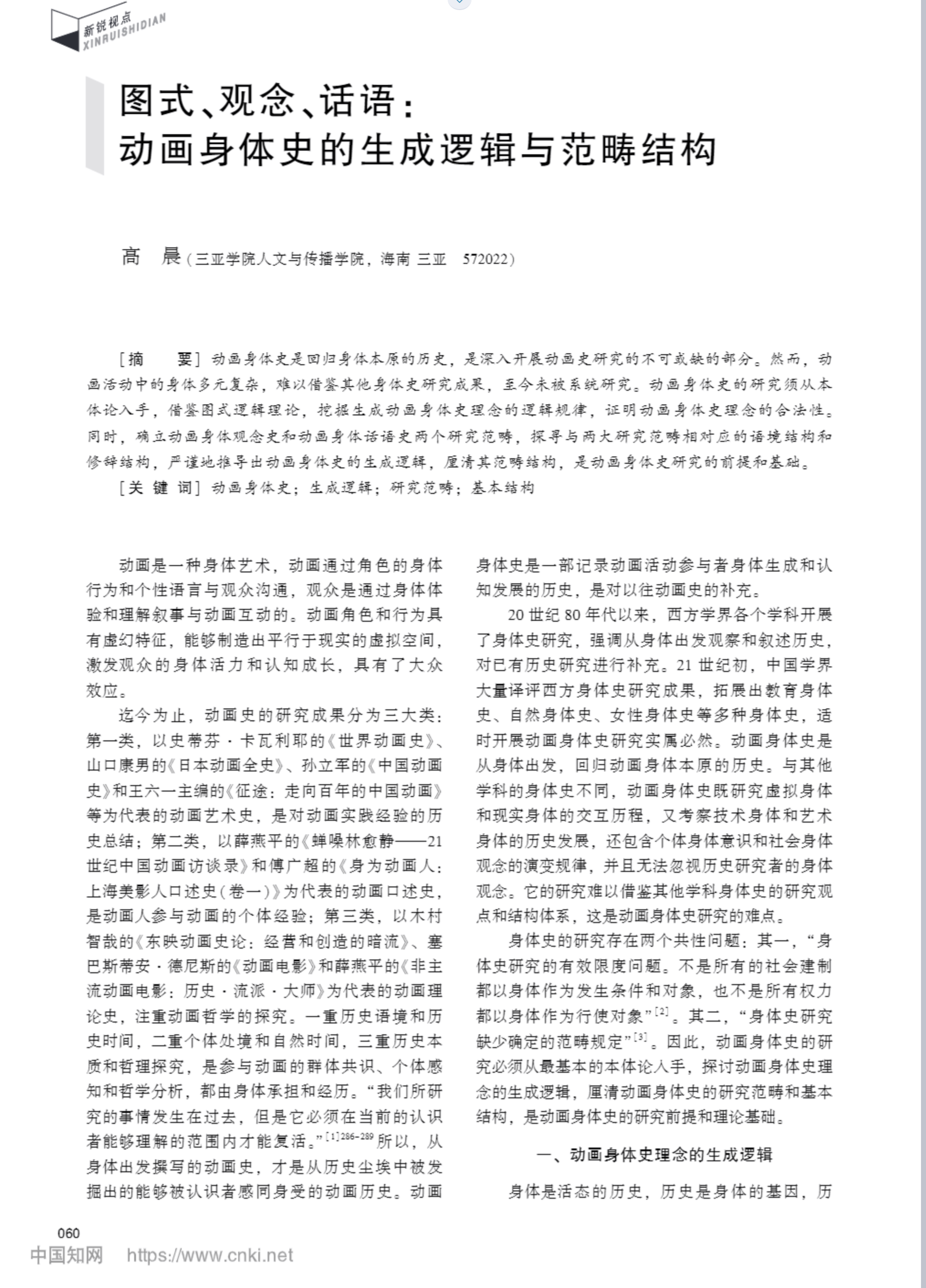 高晨教授的獲獎?wù)撐摹秷D式、觀念、話語:動畫身體史的生成邏輯與范疇結(jié)構(gòu)》,發(fā)表于《電影文學(xué)》2023年2月15日。論文指出,動畫身體史是動畫史研究的重要部分,此前因動畫活動中身體多元復(fù)雜、難以借鑒其他身體史成果,未被系統(tǒng)研究。成果從本體論入手,借鑒圖式邏輯理論,推導(dǎo)動畫身體史理念生成邏輯(從身體圖式鏈出發(fā),與語境圖式群交互,形成歷史概念圖式集),厘清“動畫身體觀念史”“動畫身體話語史”兩大研究范疇,梳理對應(yīng)的語境結(jié)構(gòu)與修辭結(jié)構(gòu),提供研究框架。其創(chuàng)新性體現(xiàn)在:視角上從身體出發(fā)梳理動畫史,補充以往研究;理論上應(yīng)用解構(gòu)主義史學(xué)理念,突破傳統(tǒng)建構(gòu)主義編纂模式;結(jié)論新穎公允,厘清動畫史與身體史關(guān)系。