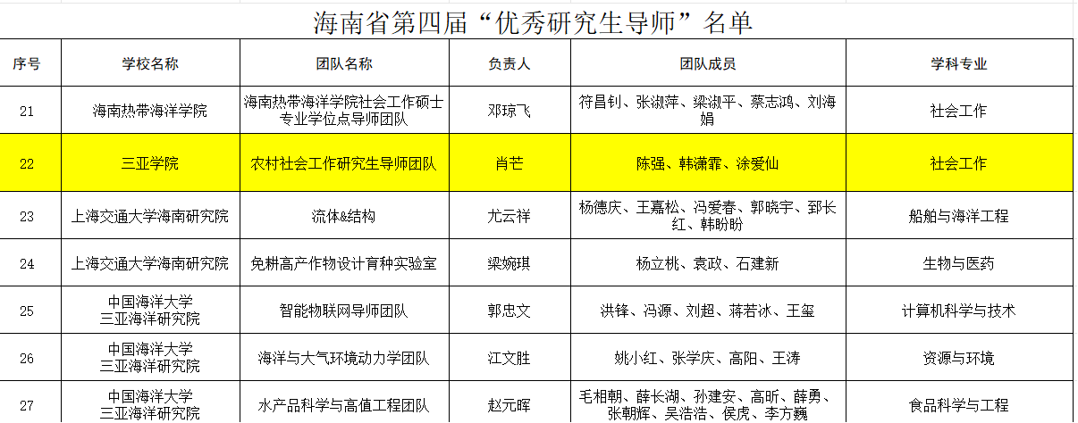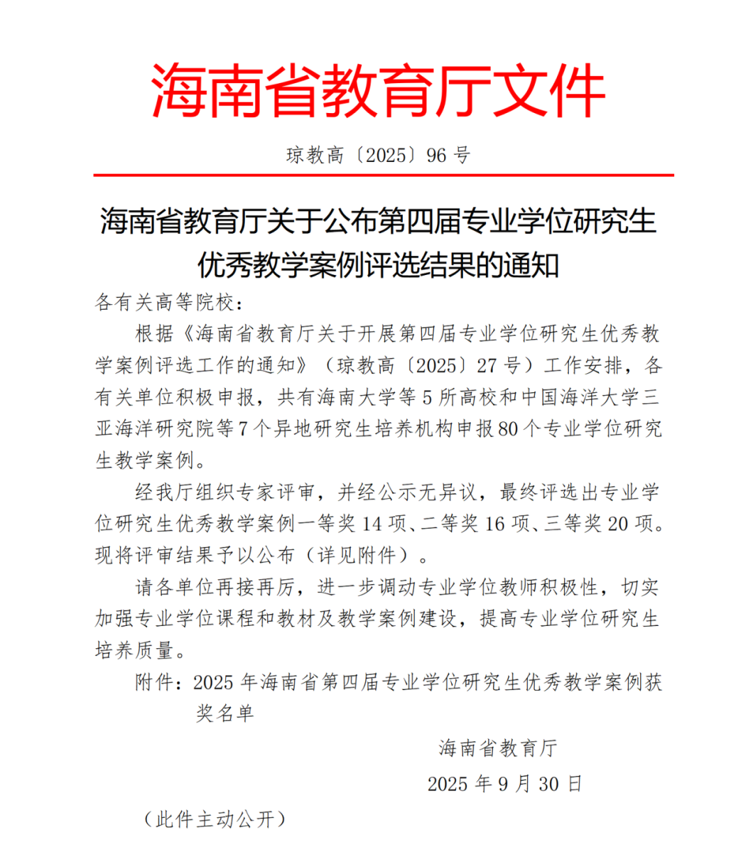 近日,海南省教育廳正式發(fā)布《海南省教育廳關(guān)于公布第四屆“優(yōu)秀研究生導師”和“優(yōu)秀研究生導師團隊”評選結(jié)果的通知》(瓊教高〔2025〕95號)及《關(guān)于公布第四屆專業(yè)學位研究生優(yōu)秀教學案例評選結(jié)果的通知》(瓊教高〔2025〕96號)。三亞學院社會工作專業(yè)蘇米雅教授獲頒“海南省優(yōu)秀研究生導師”稱號,肖芒教授帶領(lǐng)的“農(nóng)村社會工作研究生導師團隊”入選優(yōu)秀團隊;旅游與酒店管理學院閆靜副教授牽頭的《鄉(xiāng)土美學重構(gòu)與價值躍遷:一個濱海漁村的網(wǎng)紅蝶變》教學案例,以及新能源與智能網(wǎng)聯(lián)汽車學院王良成高級工程師牽頭的《產(chǎn)教融合導向的新能源汽車驅(qū)動電機仿真建模與測試》教學案例,均榮獲三等獎。