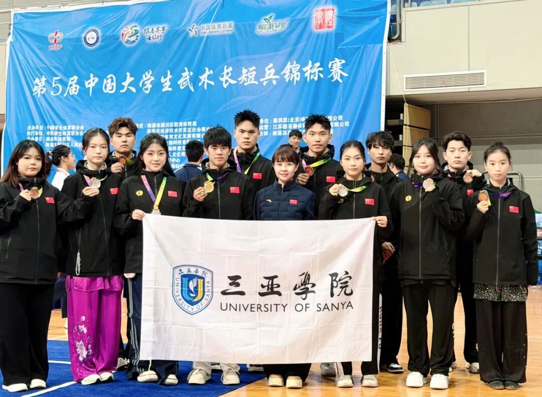 第5屆中國(guó)大學(xué)生武術(shù)長(zhǎng)短兵錦標(biāo)賽三亞學(xué)院代表隊(duì)在10名體育學(xué)子的頑強(qiáng)拼搏、團(tuán)結(jié)協(xié)作下獲得1金4銀5銅,女子團(tuán)體總分并列第三名、男子團(tuán)體總分第八名的佳績(jī),武術(shù)2301趙磊授予優(yōu)秀運(yùn)動(dòng)員、李曉媛副教授授予優(yōu)秀教練員稱號(hào)。
