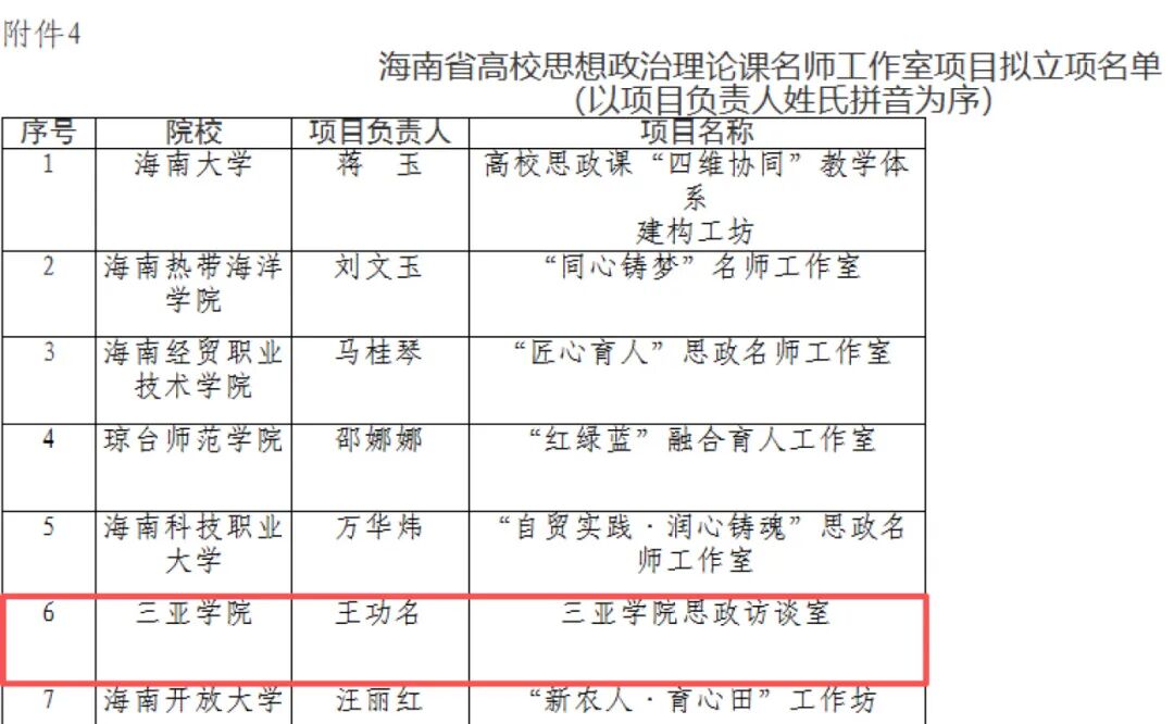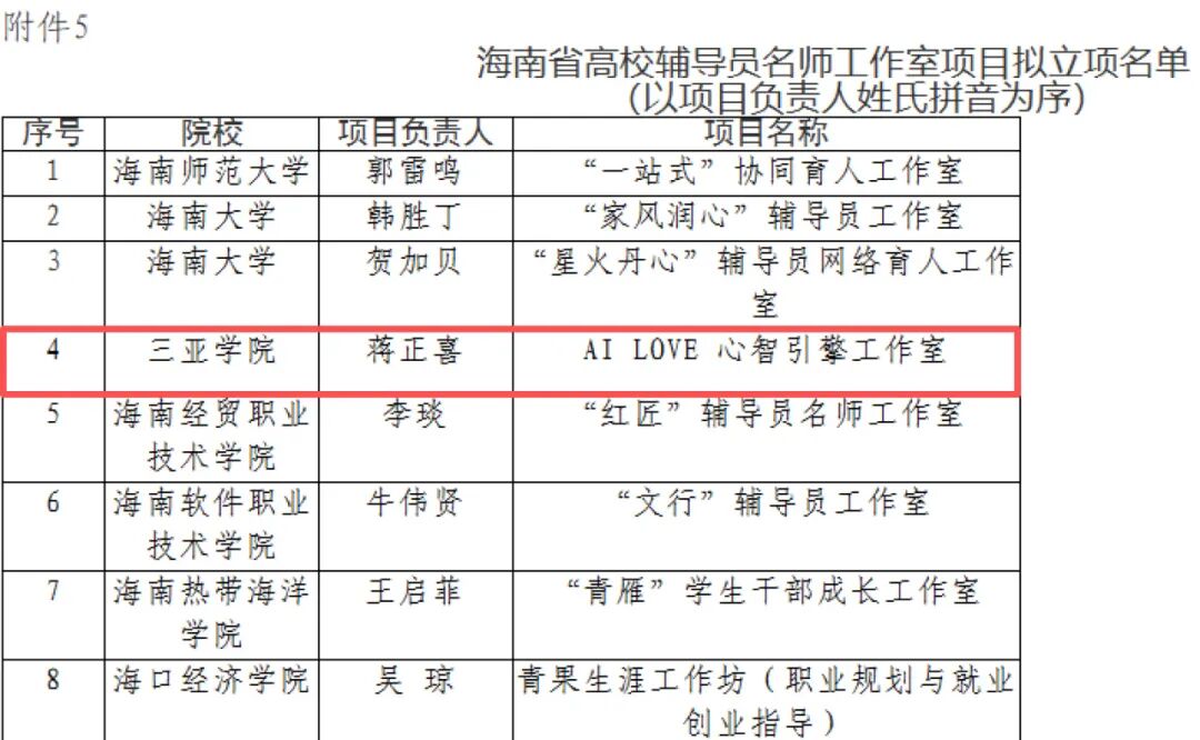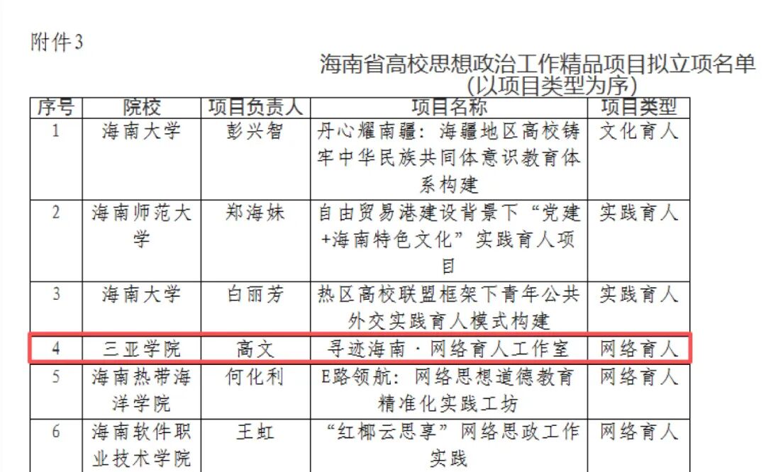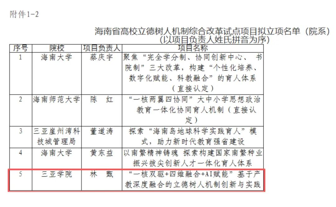在同期公布的海南省第四批高校思想政治工作質(zhì)量提升綜合改革與精品建設項目擬立項名單中,三亞學院亦有5個項目入選,涵蓋立德樹人機制改革、網(wǎng)絡育人、思政課教學創(chuàng)新、輔導員工作室與文化精品等多個領域。其中包括新能源與智能網(wǎng)聯(lián)汽車學院林甄主持的“一核雙驅(qū)+四維融合+AI賦能”基于產(chǎn)教深度融合的立德樹人機制創(chuàng)新與實踐、社會學院高文主持的“尋跡海南·網(wǎng)絡育人工作室”、馬克思主義學院王功名主持的“三亞學院思政訪談室”、社會學院蔣正喜主持的“AI LOVE 心智引擎工作室”,以及人文與傳播學院賴振寅主持的舞臺劇《清風——蘇東坡在海南》。