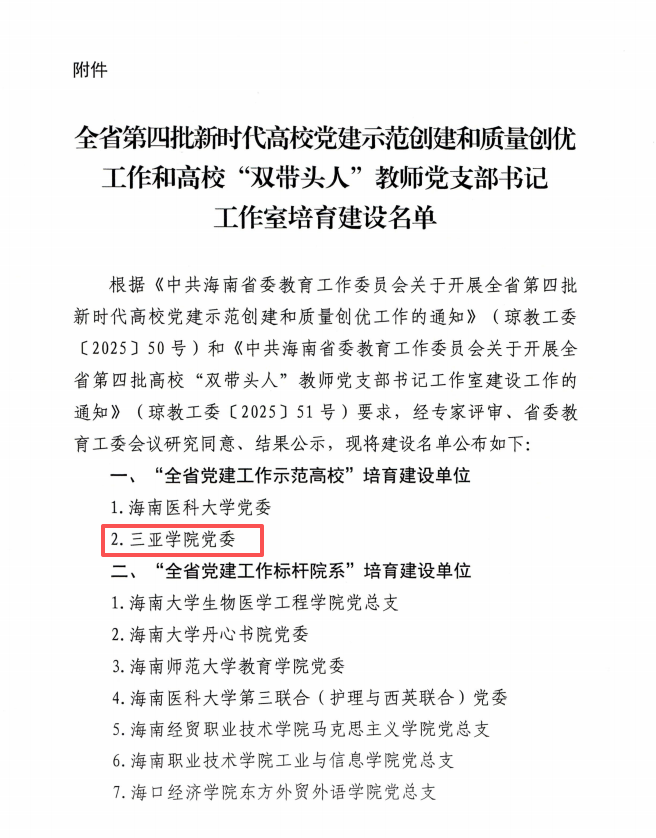 近日,中共海南省委教育工作委員會公布全省第四批新時代高校黨建示范創(chuàng)建和質(zhì)量創(chuàng)優(yōu)工作名單,三亞學院成功入選“全省黨建工作示范高?!迸嘤ㄔO單位,是歷次評選以來唯一獲此殊榮的民辦高校。同時,學校在黨建與思政類項目評選中表現(xiàn)突出,共獲9項立項,立項總數(shù)位居全省民辦高校首位,占全省民辦高校立項總數(shù)的約60%,充分彰顯學校黨建與思政工作的示范引領作用。